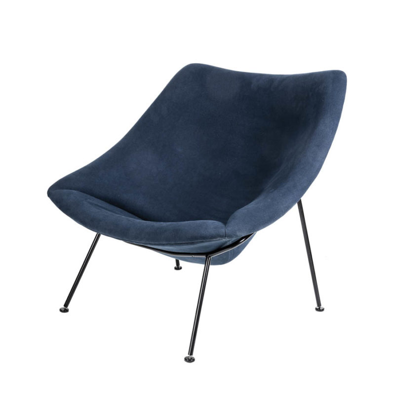 Poltrona com estrutura em aço cromado, e concha em fibra de vidro; estofada em tecido.